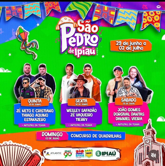 Uma das festas mais tradicionais da região Sul, o São Pedro de Ipiaú confirmou a realização da Festa de São Pedro 2023 e anunciou as atrações que farão parte do evento que será realizado entre os dias 29 de Junho e 02 de Julho. A extensa programação que envolve apresentações culturais, concursos de quadrilhas e outras atividades contará com diversos shows de artistas nacionais, regionais e locais.