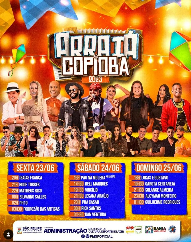 O São João de São Felipe 2023 promete continuar sendo um evento repleto de alegria, união e diversão para toda a família. Nomeado como o Arraiá da Copioba 2023, São João de São Felipe 2023 está com data marcada para os dias 23 a 25 de junho.