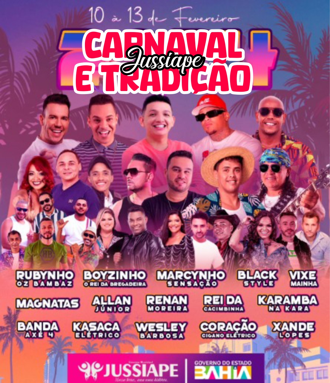 Jussiape Carnaval e Tradição, a Prefeitura Municipal, anunciou as atrações que animarão os foliões durante quatro dias de festa. O evento será realizado em Caraguataí, distrito de Jussiape, de 10 a 13 de fevereiro de 2024, contando com a participação de artistas de axé music, pagode, piseiro e arrocha.