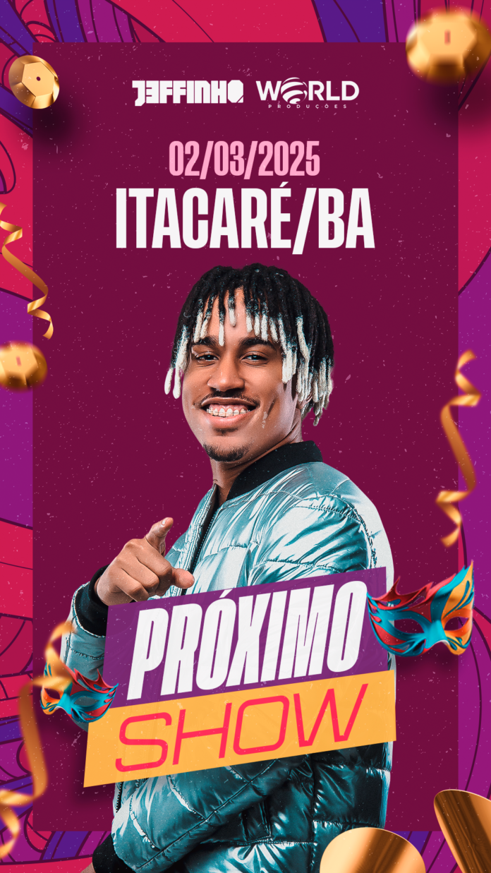 Com um repertório recheado de sucessos e coreografias que envolvem o público do início ao fim, Jeffinho deve levar muito swing e animação ao palco principal do evento, reforçando sua conexão com os foliões e garantindo um verdadeiro espetáculo.