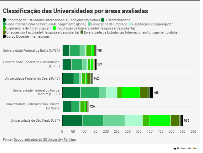 Os demais critérios de desempenho ficaram com as seguintes pontuações. Proporção de alunos docentes (11,8), Proporção Internacional de Docentes (6,9), Citações por Faculdade (5,7) e Reputação do Empregador (5,0). Os indicadores ligados à internacionalização estudantil registraram as notas mais baixas, com Proporção de Estudantes Internacionais (2,0) e Diversidade de Estudantes Internacionais (1,8).